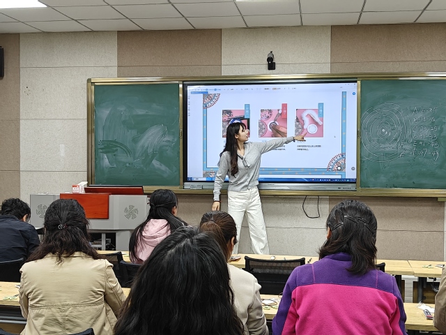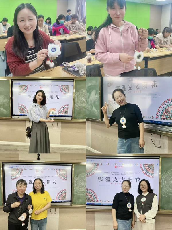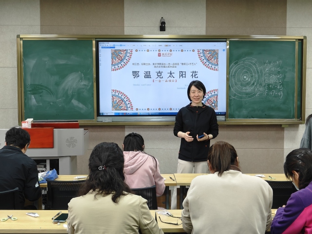 4月23日下午,由校工会、妇联主办,美术学院承办的一会一品项目“教职工+手艺人”助力乡村振兴系列活动之鄂温克太阳花制作活动在美术学院微格教室308举行。来自全校各单位的教职工30余人参加了此次活动。美术学院赵冬霞老师及研究生团队为参加活动的教职工讲解了鄂温克太阳花的历史起源、文化内涵、基本样式、制作流程等,带领大家共同感受来自内蒙古鄂温克太阳花的独特魅力。