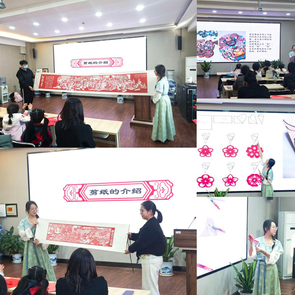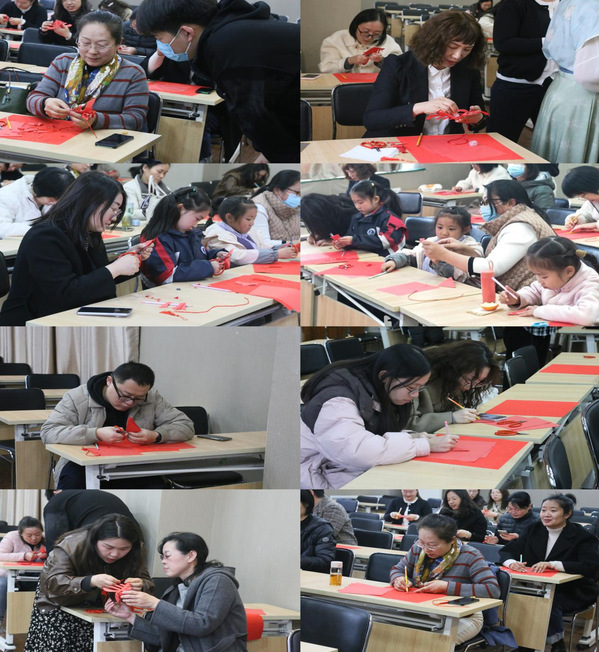 活动现场,徐州市青年艺术家协会成员、物电学院本科生李子情为大家讲解了剪纸艺术的历史渊源与文化内涵,并展示了其精心创作的剪纸作品《十二金钗》和《清明上河图》。随后,她现场演示了“立体春”和“团花”剪纸的创作过程,从选纸、折纸到剪刻、展开,在她的细致讲解和青年剪纸爱好者们的耐心指导下,老师们和小朋友们纷纷拿起剪刀,跃跃欲试。伴随着剪刀在纸间的轻盈舞动,一幅幅栩栩如生、寓意深远的剪纸作品逐渐呈现,现场气氛热烈,充满了欢声笑语。