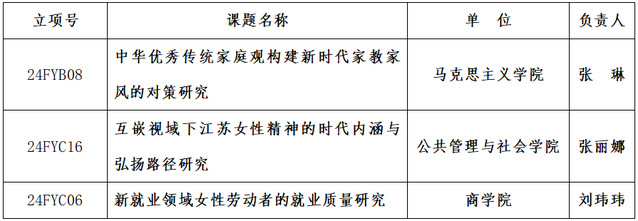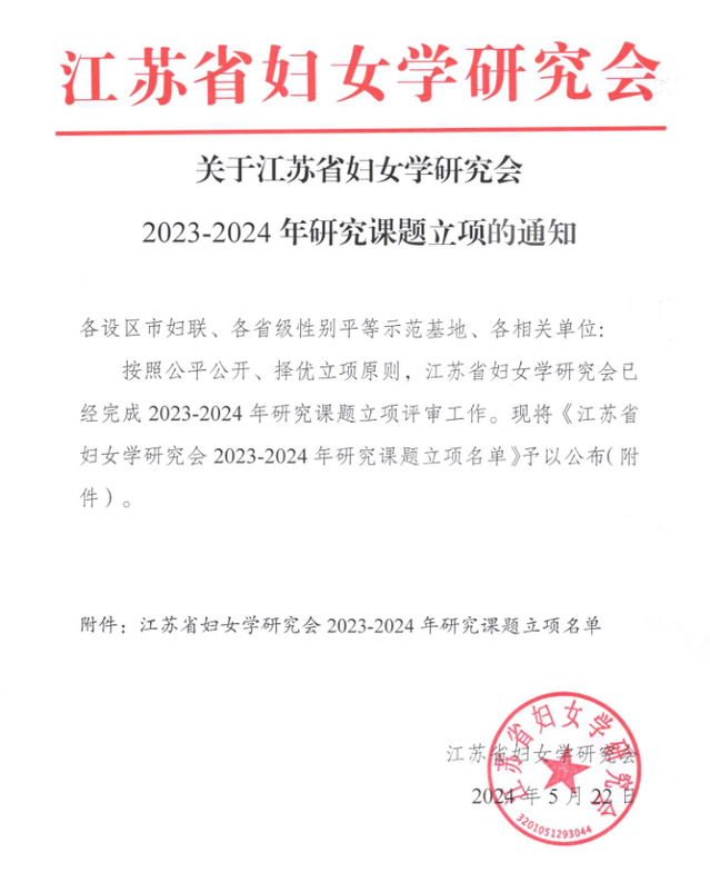 近日,江苏省妇女学研究会公布了2023-2024年研究课题立项名单,我校女教师获得3项研究课题立项,是全省获立项最多的单位。