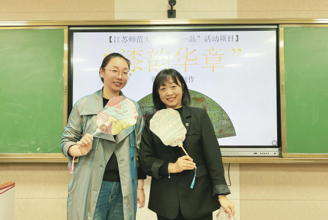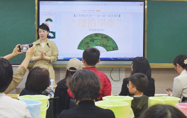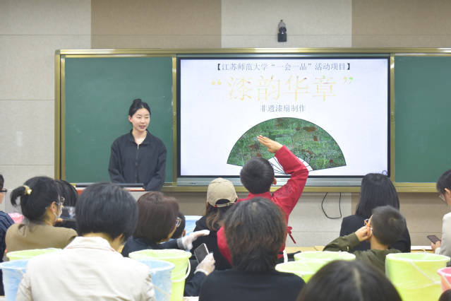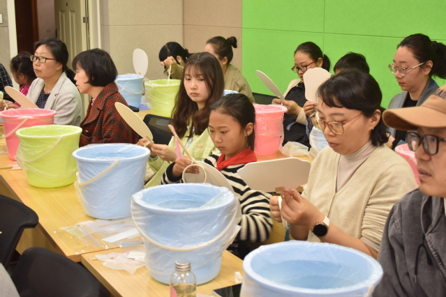 4月19日下午,由校工会、妇联主办,美术学院承办的一会一品项目“漆韵华章:非遗漆扇制作活动”在美术学院微格教室308举行。来自全校各单位的教职工及子女30余人参加了此次活动。美术学院赵冬霞老师及研究生团队为参与活动的教职工及子女讲解了漆扇的艺术起源、工艺材料、流程方法、注意事项等,带领大家共同感受非遗文化的魅力。