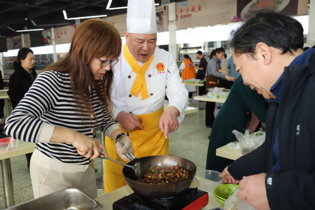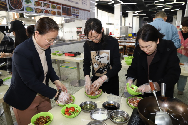 3月29日下午,由校工会与校妇联主办,后勤集团工会承办“妙手美食汇”系列之家常菜干煸辣子鸡制作教学活动在泉山三食堂举行。来自全校各单位的30多名教职工参加了活动。校工会副主席汪家军应邀参加,体验制作传统美食的乐趣。活动由后勤集团工会主席唐徐生主持。饮食服务中心副主任、高级厨师刘保国担任指导老师。