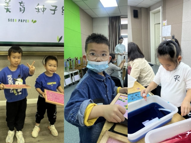 本次活动的实践环节是“种子纸”的制作。运用到了中国古代四大发明之一“造纸术”,此工艺也是我国的非物质文化遗产之一。今时我们简化工序,造纸盆里搅匀纸浆,再将种子放入纸浆水里,加入干花、食用色素等材料作为装饰,经过抄纸、控水、阴干的步骤就能得到一张种子纸。