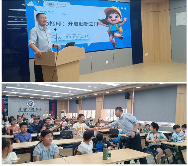 活动伊始,机电工程学院党委书记何莉娜对参与活动的教职工家庭表示热烈欢迎和衷心感谢,值此端午佳节与“六一”儿童节双节来临之际,为大家送上节日祝福,并祝愿本次活动能让每个家庭满载亲子温情,趣探智造奥秘,共享独特的双节记忆。在专题讲座环节,邹伟老师通过一系列丰富多彩的图片和视频,从精密的航天零件到萌趣的卡通模型,深入浅出地解读3D打印技术。随后,大家一同前往实验室进行实践体验。王善奎老师首先为孩子们现场演示3D打印流程,从模型设计、切片处理到机器操作,每个步骤清晰直观,揭开了智能制造的神秘面纱,之后孩子们分组进行实践操作,亲身体验3D打印过程。活动最后,学院为每位孩子发放了精美的3D打印小礼品,让此次科技之旅留存温暖印记。