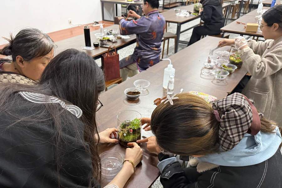 活动以“绿色美育+心灵舒缓”为理念,紧扣乡村振兴与生态文明建设主题,以集露瓶造景为载体,将自然园艺美学与传统手工匠心巧妙融合。活动现场,美术学院赵冬霞老师带领研究生团队全程提供专业指导,从集露瓶选择、基质铺设,到绿植搭配、装饰点缀,耐心讲解每一个创作细节,手把手指导大家完成作品。老师们在轻松的氛围里动手创作,于一土一石、一草一木间感受自然意趣,在精心搭建中锤炼耐心与专注力,既舒缓了身心压力、陶冶了艺术情操,也在实践中加深了对绿色理念的理解。